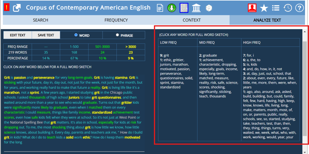 當我們進入COCA的網頁頁面中,在「分析文本」(Analyze the Text)項下,把你想要閱讀的英文文章或其他你想學習的英文文本等,整篇複製貼上點選「搜尋」(search)後,COCA會依據文本的內容,將單字區分出「低頻率字」(LOW FREQ)、「中頻率字」(MID FRED)和「高頻率字」(HIGH FREQ)。這邊我以 Angela Lee Duckworth教授「成功的關鍵:恆毅力(The key to success? Grit)一書中的一段話,請COCA幫忙分析出高、中、低頻率單字。下圖是搜尋結果及建議的單字整理方式: